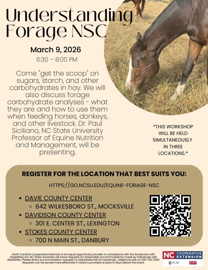 Collapse ▲Join N.C. Cooperative Extension on Monday, March 9 at 6:30 p.m. to learn about Understanding Forage NSC for your horses. This workshop will be held simultaneously in three locations. Choose which location suits you best: